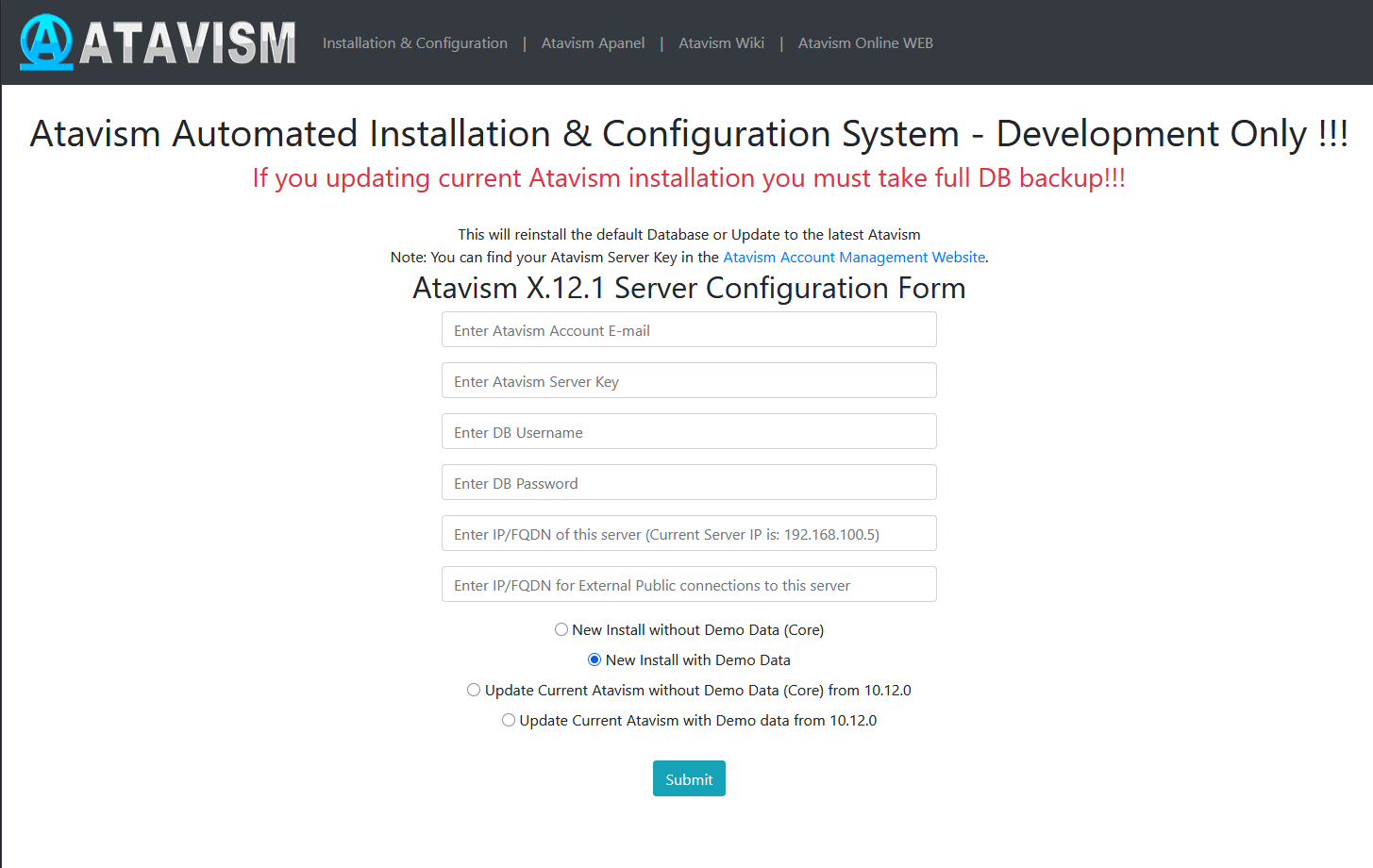 Step 2: Follow instructions like you would do the first installation, but with the option Update Current Atavism depending on your installation (Core or with Demo Data). Open the address in a web browser http://server_IP/atavism/installation/install.php