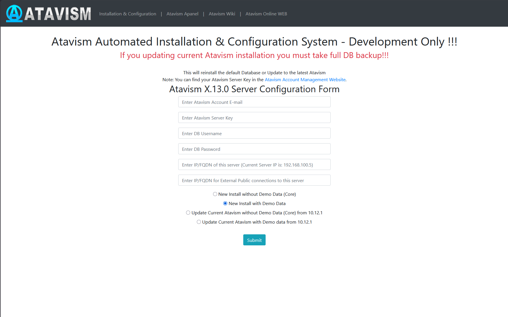 Step 2: Follow instructions like you would do the first installation, but with the option Update Current Atavism depending on your installation (Core or with Demo Data). Open the address in a web browser http://server_IP/atavism/installation/install.php