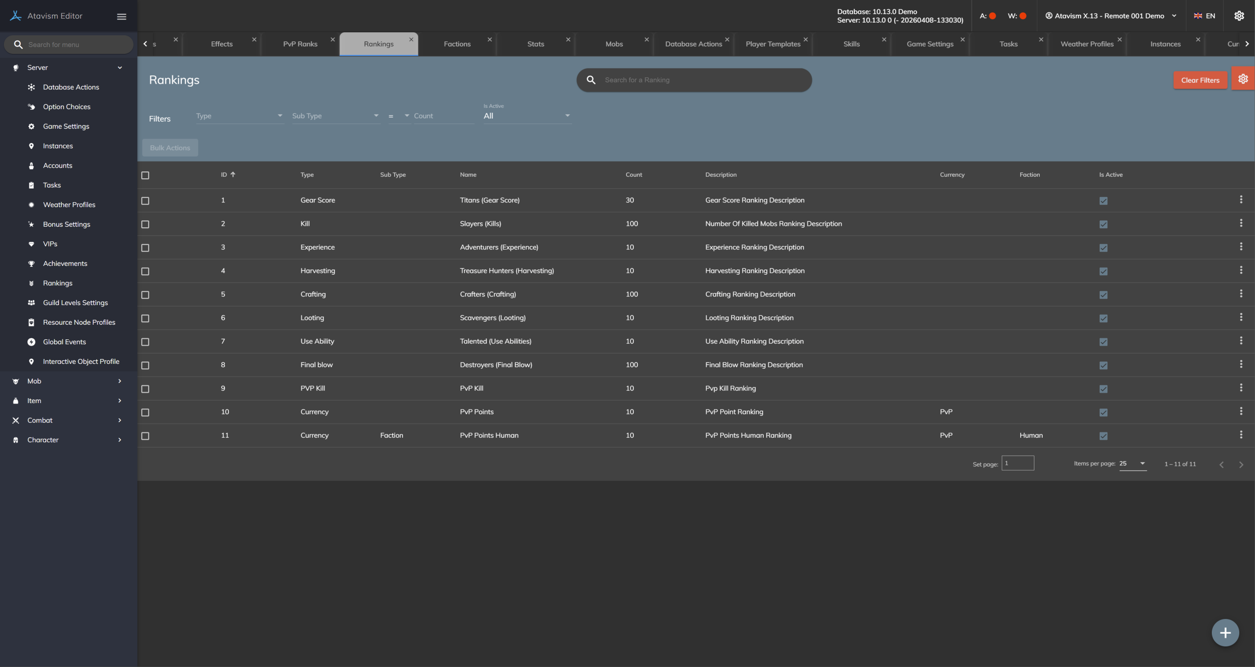 - PVP_RANKING_RESET_INTERVAL – Defines PvP rankings reset interval in hours. PvP rankings are of type “PvP Kill” and all “Currency”, whereas the currency was set to the one assigned in PvP Ranks, by default, PvP currency – Integer – Default value: 720 (30 days)