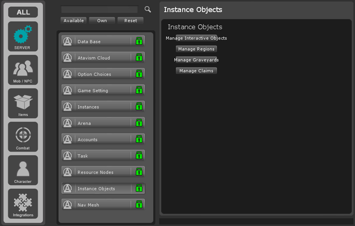 交互式对象在Unity编辑器中设置,然后使用Atavism编辑器保存到内容数据库。
